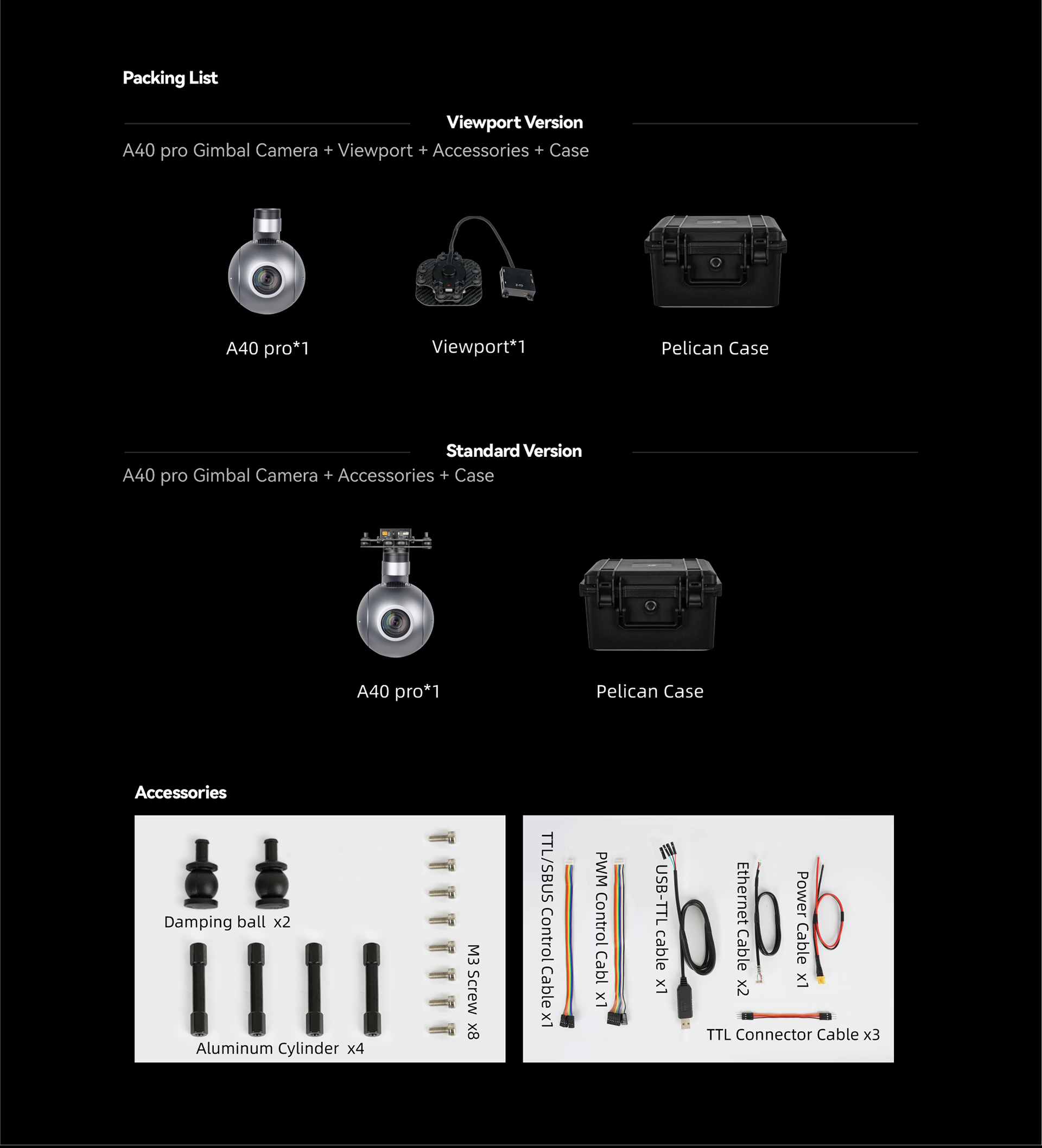 | Accessories | 1pc gimbal camera device, screws, copper cylinders, damping balls, damping boards, 1pc USB to TTL cable / Hight quality plastic box with foam cushion |