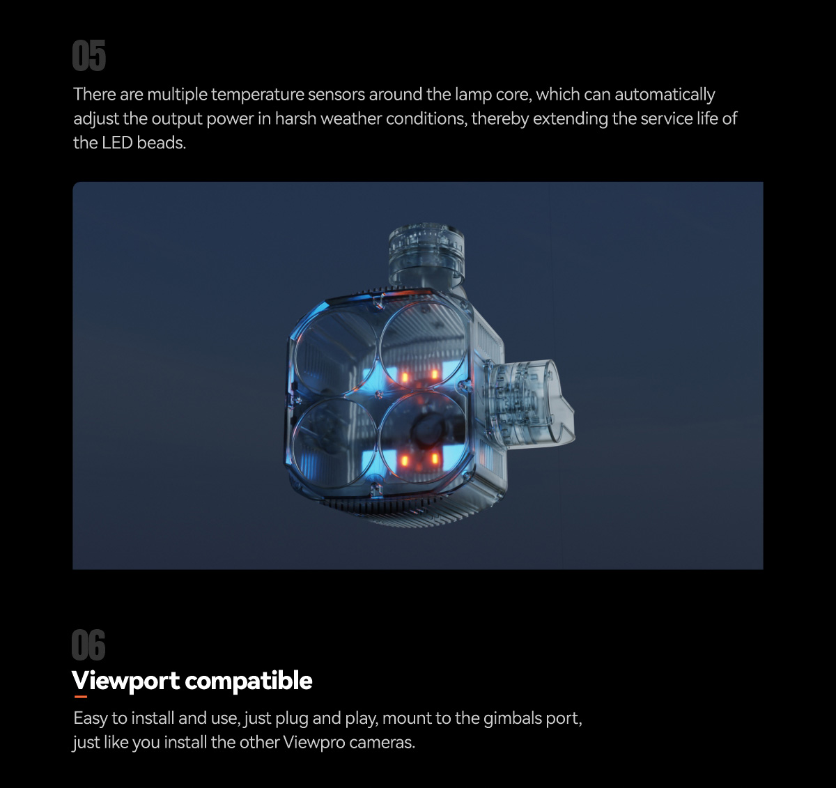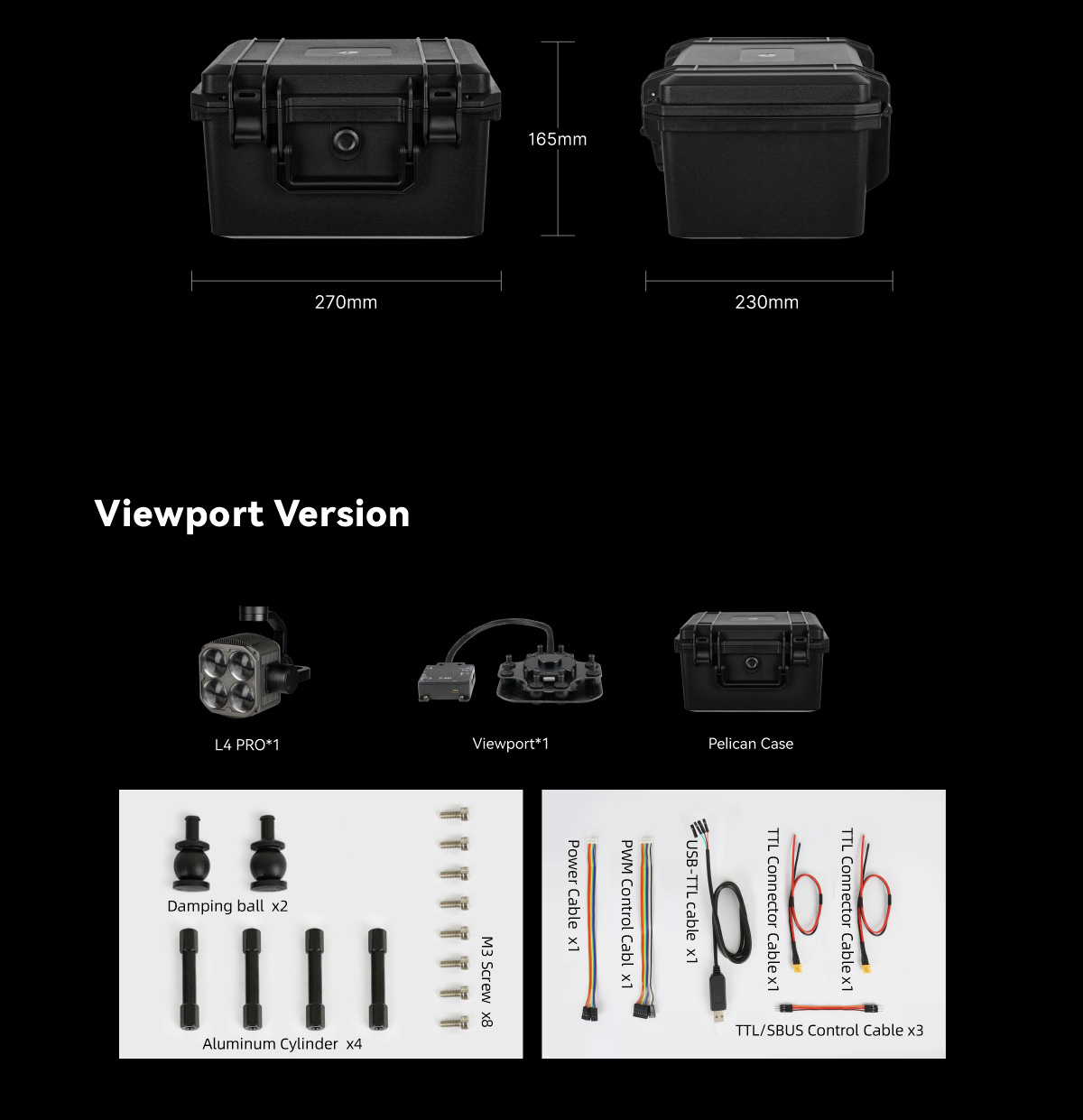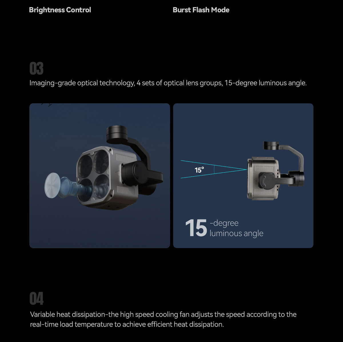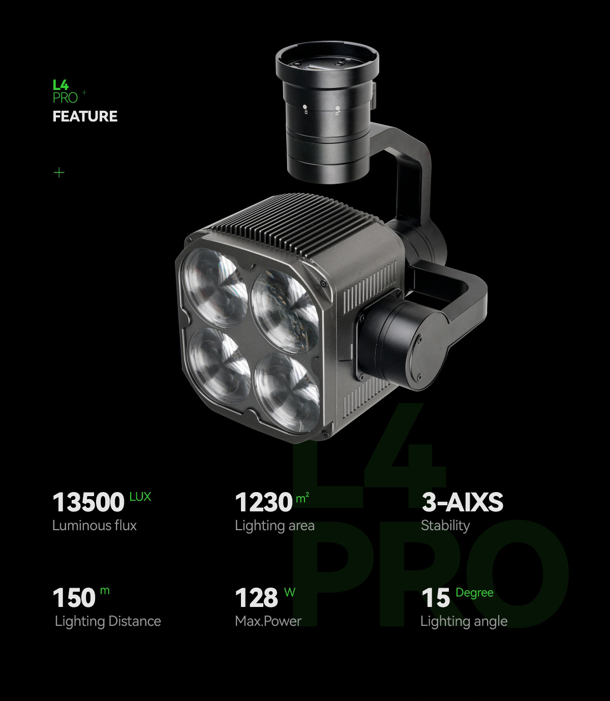 The L4 Pro , 3-Axis stabilized gimbal searchlight,providing an excellent illumination effect for operations.It supports remote control ,PWM /S.BUS and TTL and pitch control can reach up to 90°,Compatible with DJI . L4 Pro is super bright, up to 13500LM, with a max lighting area to 1230m².The overall design is lightweight at only 925 g.