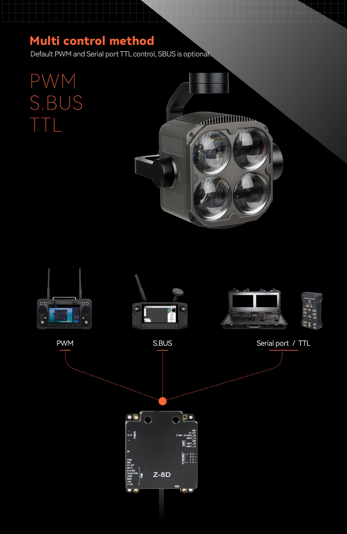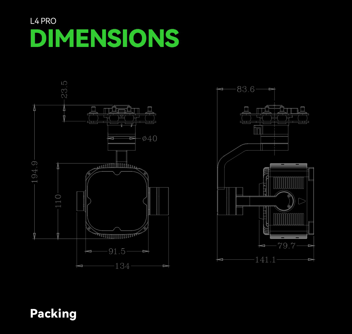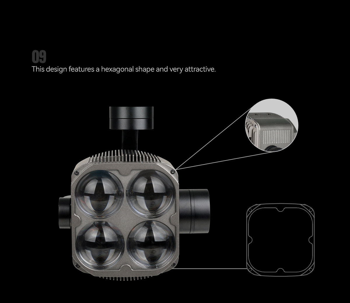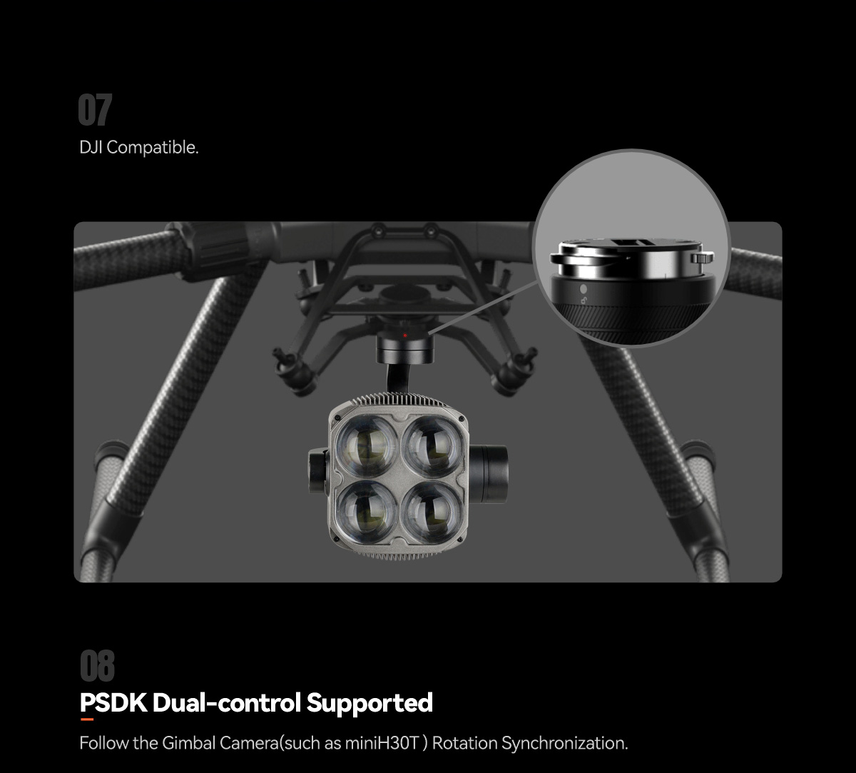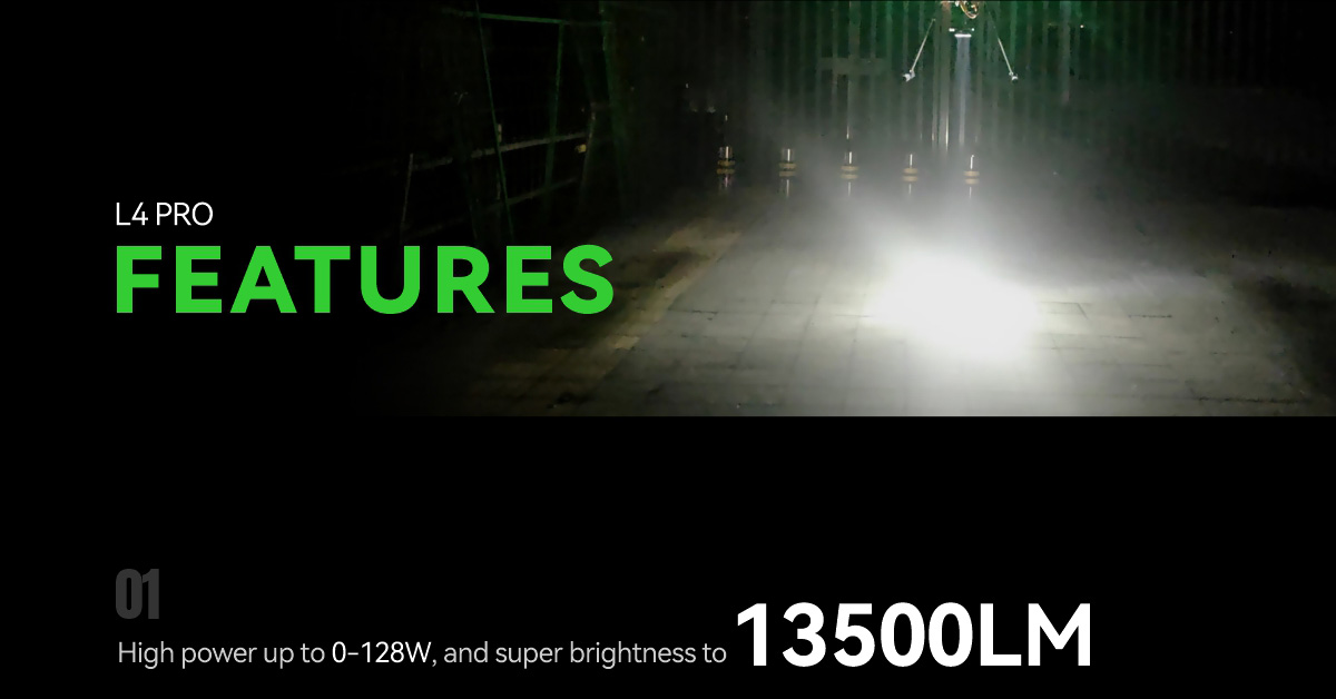 The L4 Pro , 3-Axis stabilized gimbal searchlight,providing an excellent illumination effect for operations.It supports remote control ,PWM /S.BUS and TTL and pitch control can reach up to 90°,Compatible with DJI . L4 Pro is super bright, up to 13500LM, with a max lighting area to 1230m².The overall design is lightweight at only 925 g.