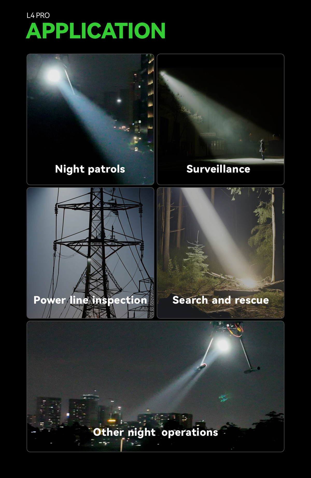 The L4 Pro brings aerial illumination effect during night operations to a whole new level. Our L4 Pro spotlight is widely used for night patrols, surveillance, power line inspection, search and rescue, and other night operations.