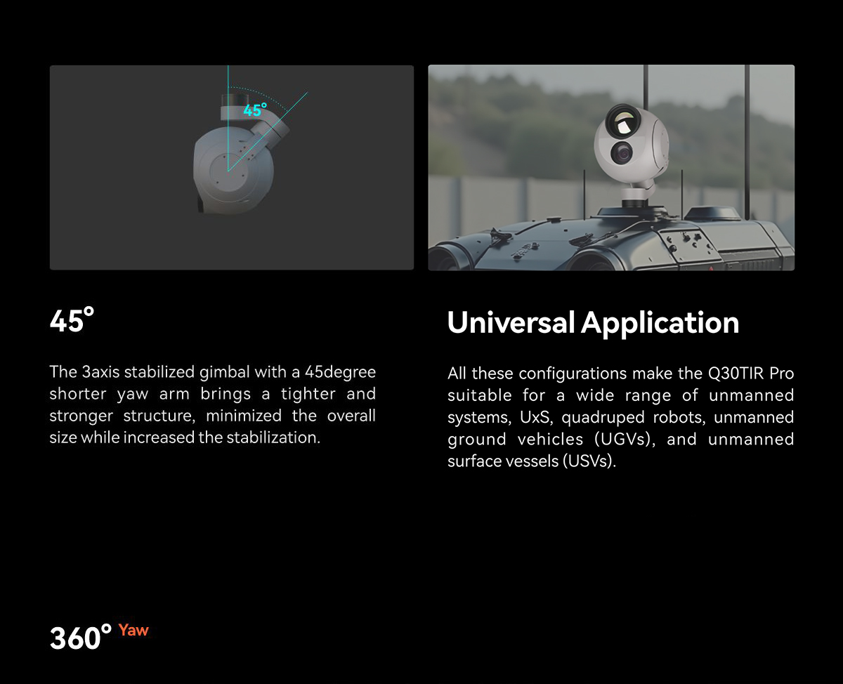 | Mechanical Range | Pitch/Tilt: -110°~130° , Roll: ±40° , Yaw/Pan: ±360°*N | |