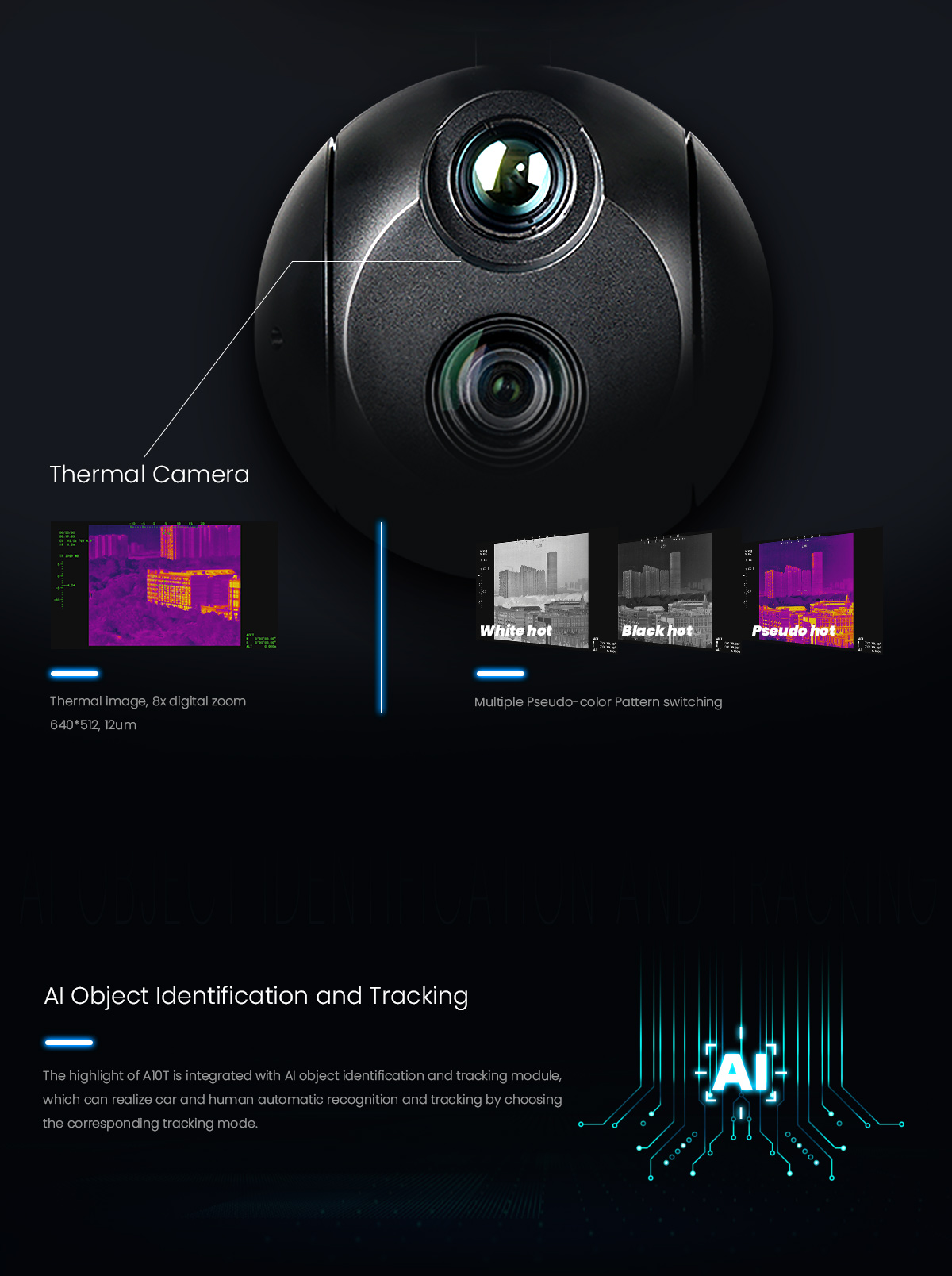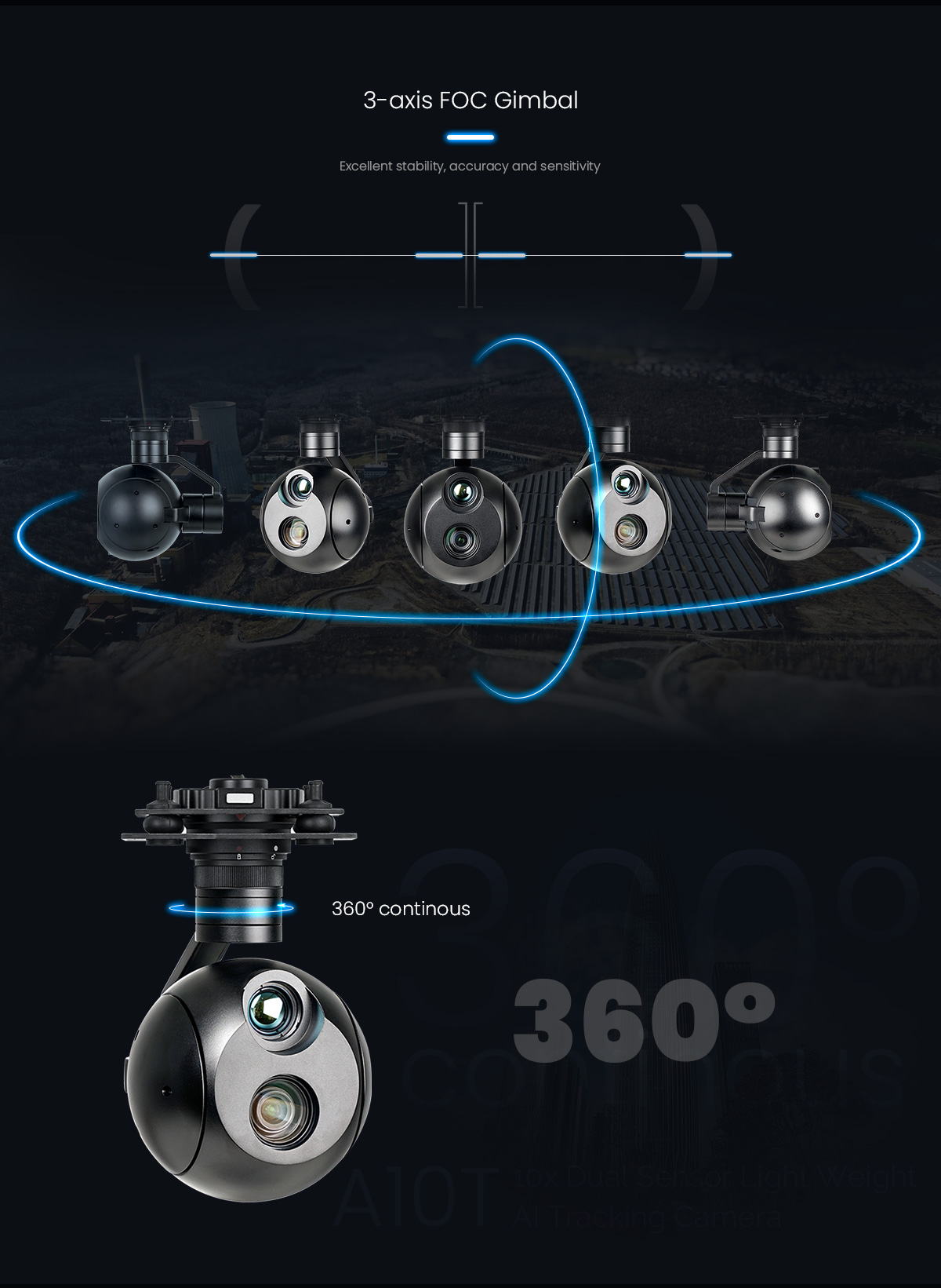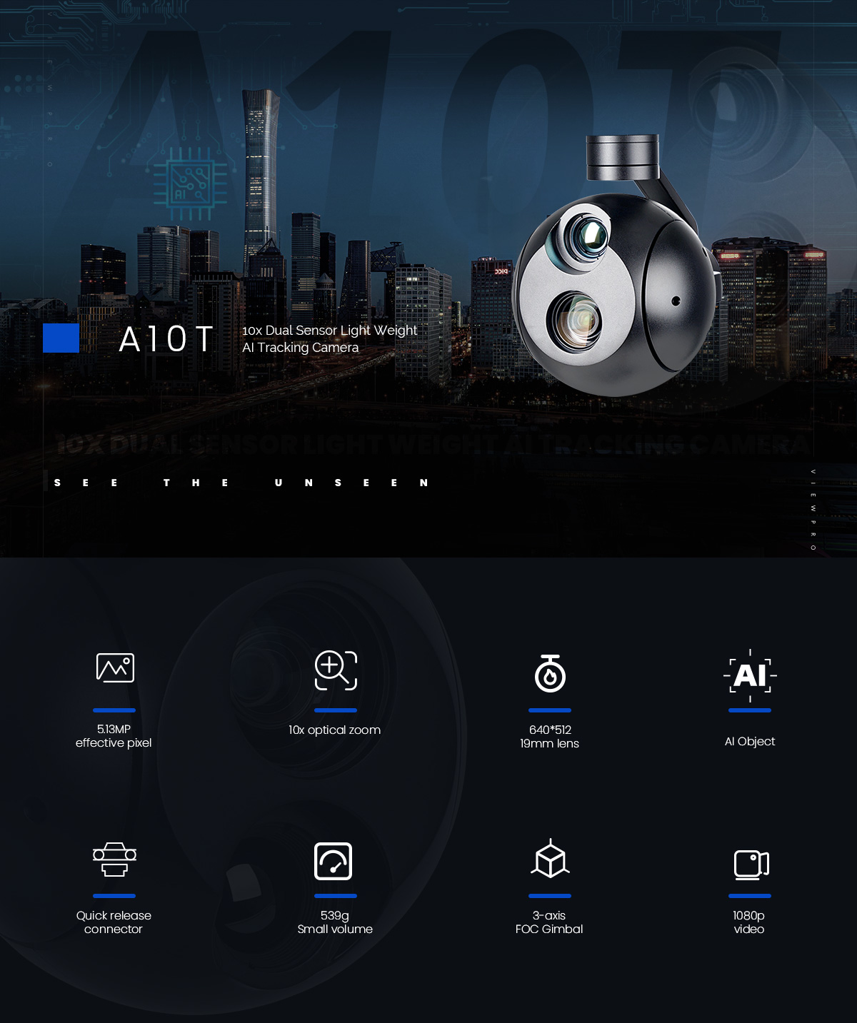 A10T Pro is a dual-sensor gimbal camera featuring 539g light net weight, small volume and compact structure, which integrates a 10x optical zoom and a 19mm lens 640*512 thermal camera. It with 3-axis high-precision gimbal which has advantages of better metal texture, anti-interference and better heat dissipation. It is integrated with AI object identification and tracking module, which can realize car and human automatic recognition and tracking. It widely used in inspection, surveillance, search and rescue and other industrial applications.