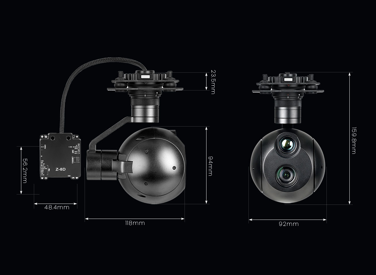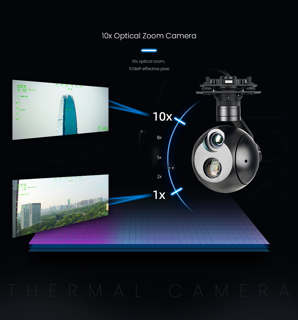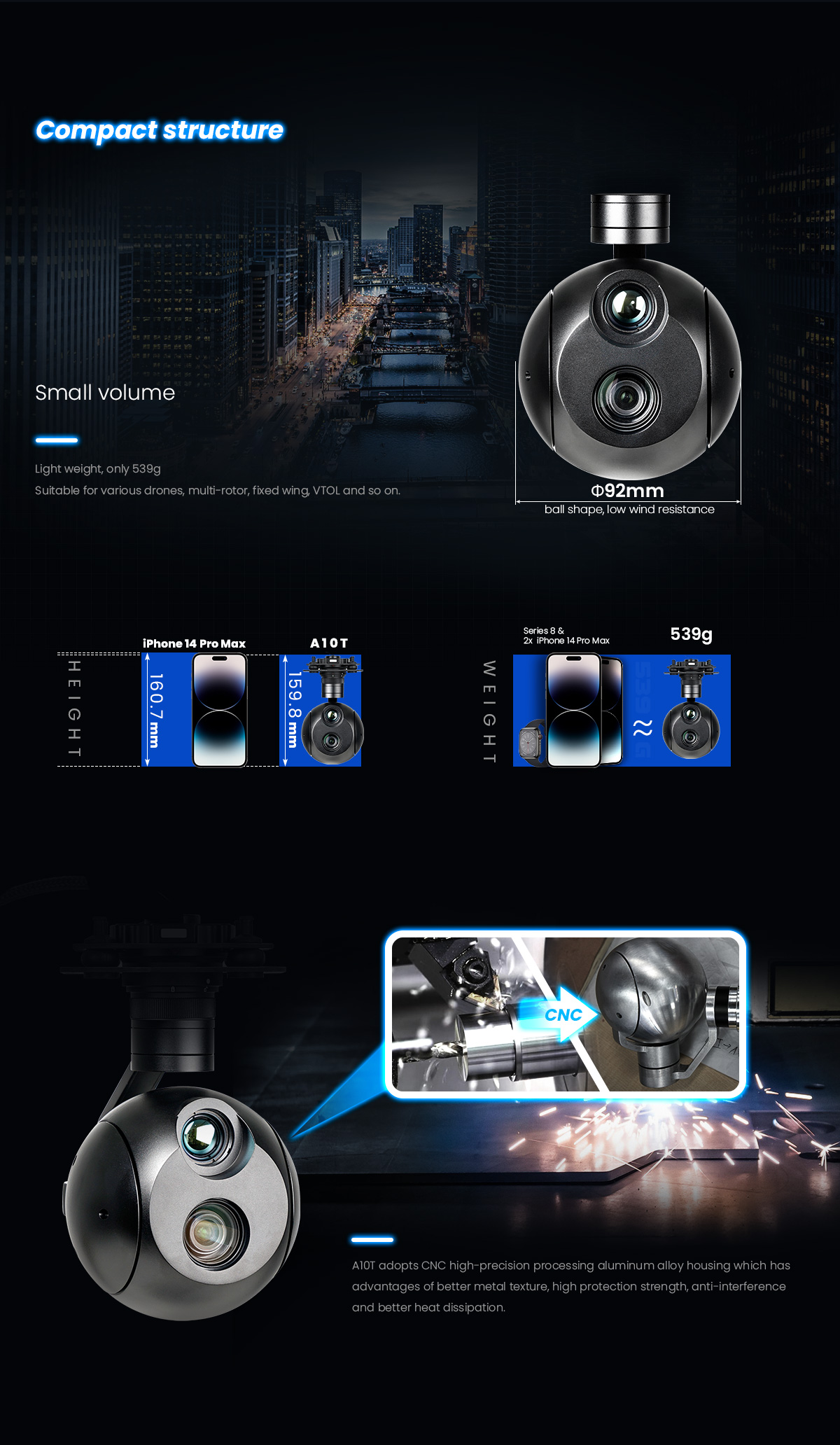 A10T Pro is a dual-sensor gimbal camera featuring 539g light net weight, small volume and compact structure, which integrates a 10x optical zoom and a 19mm lens 640*512 thermal camera. It with 3-axis high-precision gimbal which has advantages of better metal texture, anti-interference and better heat dissipation. It is integrated with AI object identification and tracking module, which can realize car and human automatic recognition and tracking. It widely used in inspection, surveillance, search and rescue and other industrial applications.