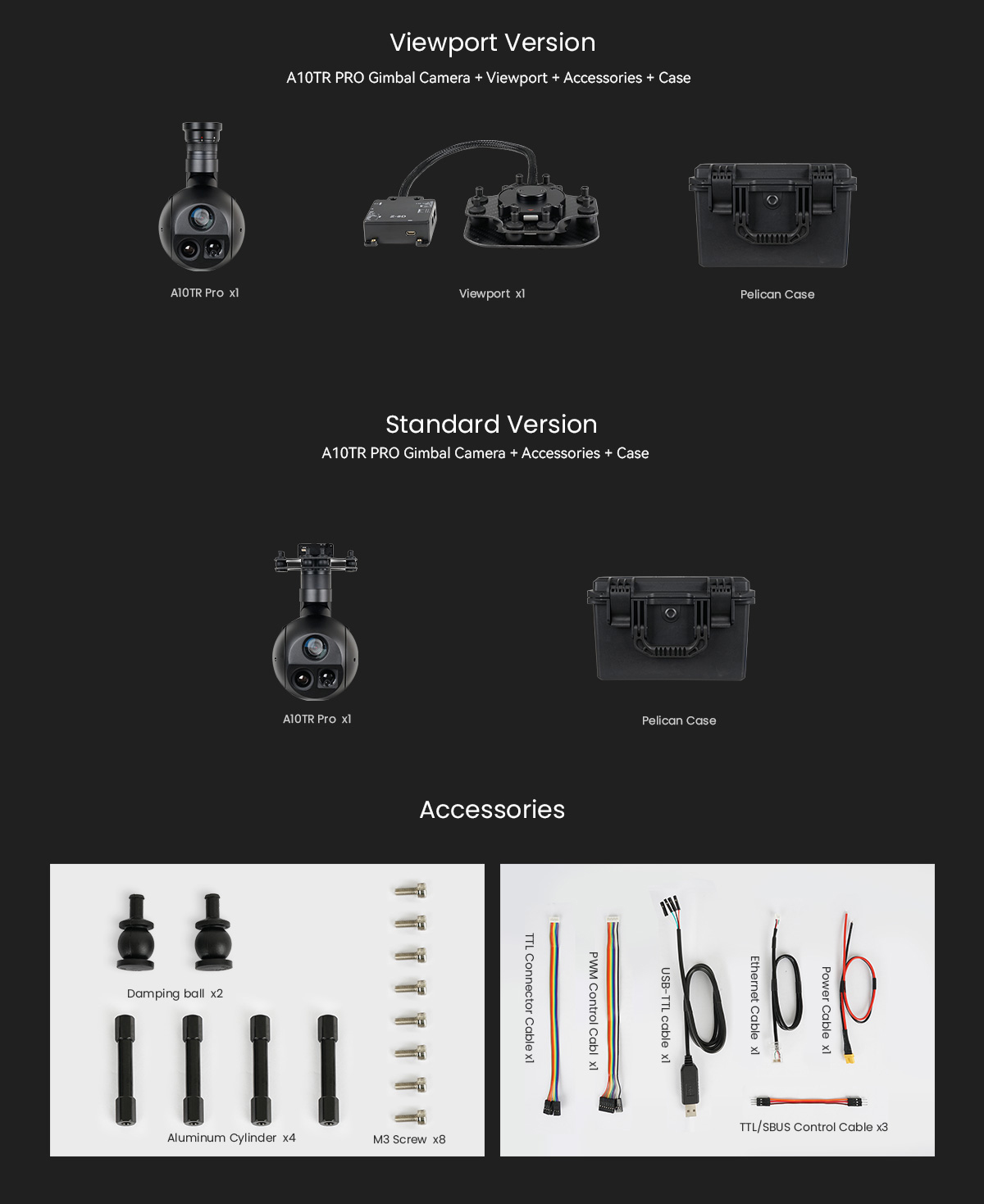 Accessories | 1pc gimbal camera device, screws, copper cylinders, damping balls,1pc USB to TTL cable / Hight quality plastic box with foam cushion |