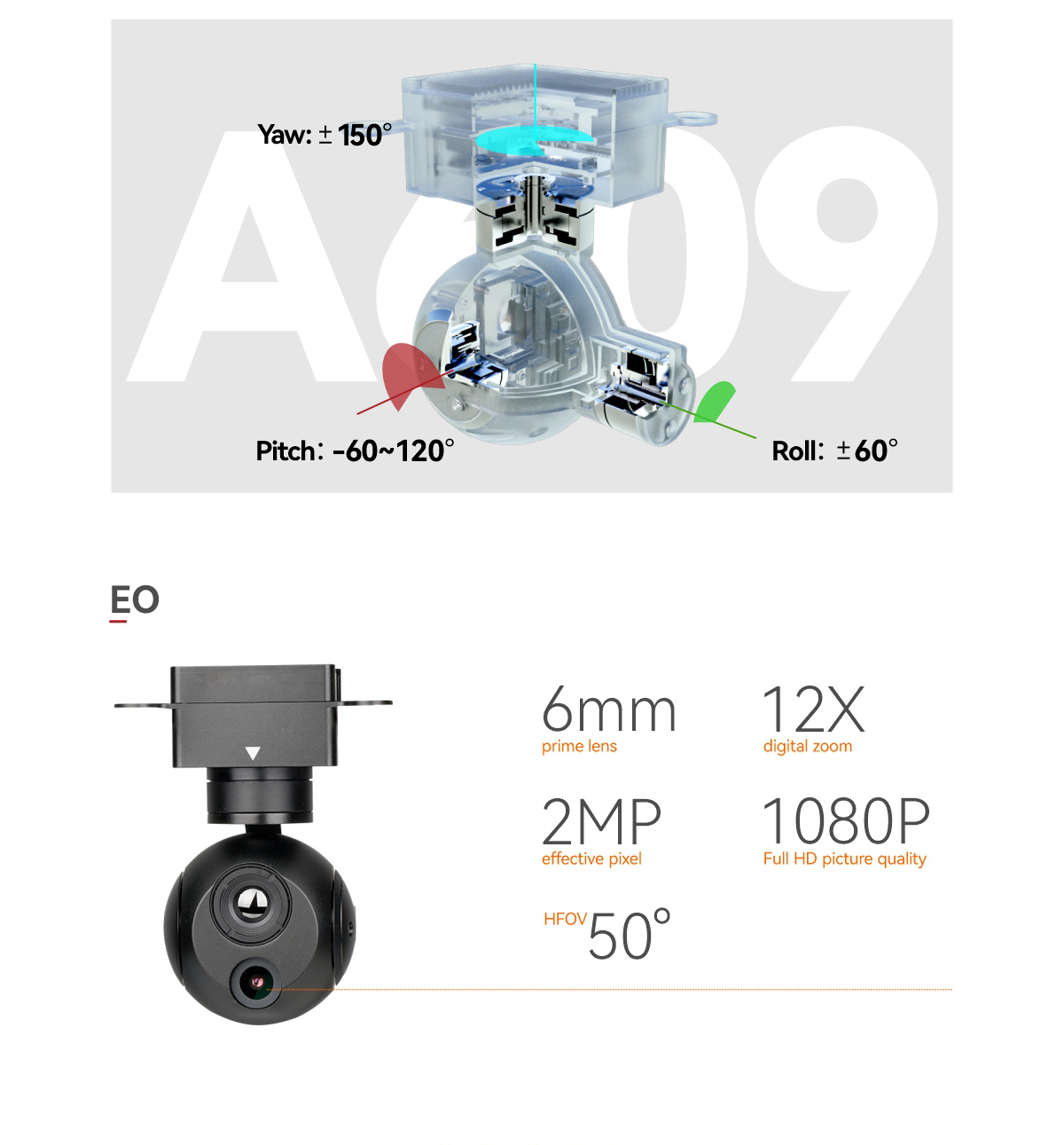 | Angle scope of structure design | Pitch/Tilt: -60°~120°, Roll: ±60°, Yaw/Pan: ±150° |