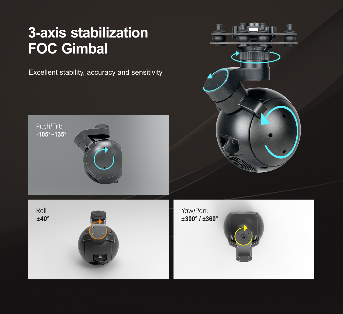 Mechanical Range | Pitch/Tilt: -110°(Up)~130°(Down), Roll: ±40°, Yaw/Pan: ±300° / ±360°*N (IP output version) |