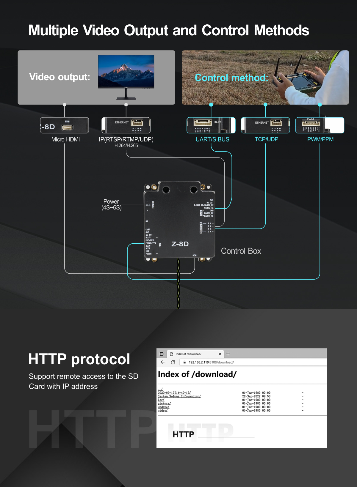 Control method | PWM / TTL / S.BUS / TCP / UDP |
