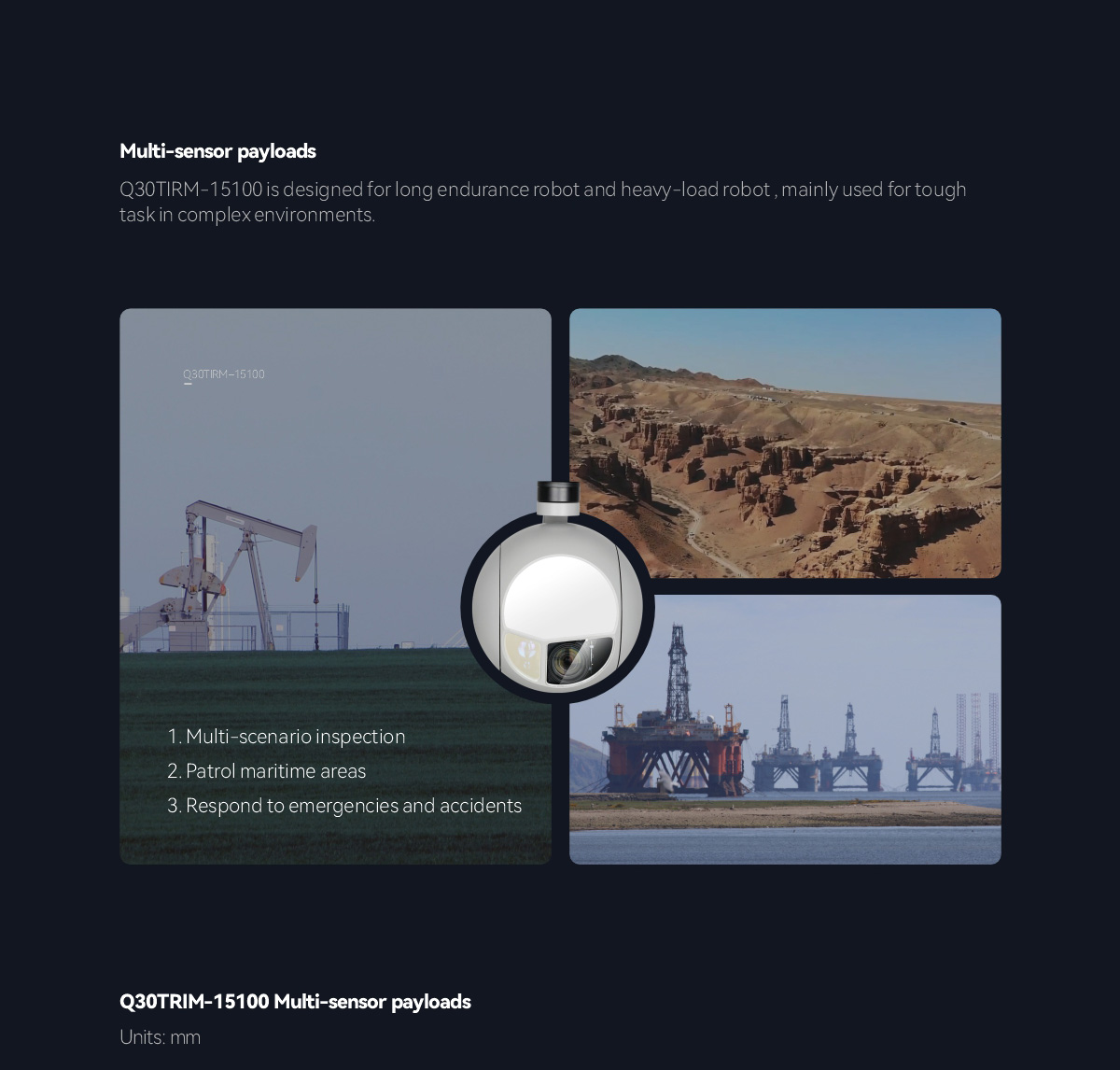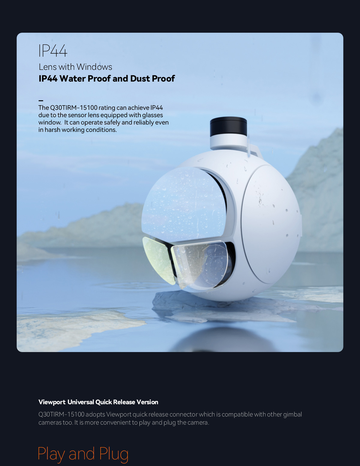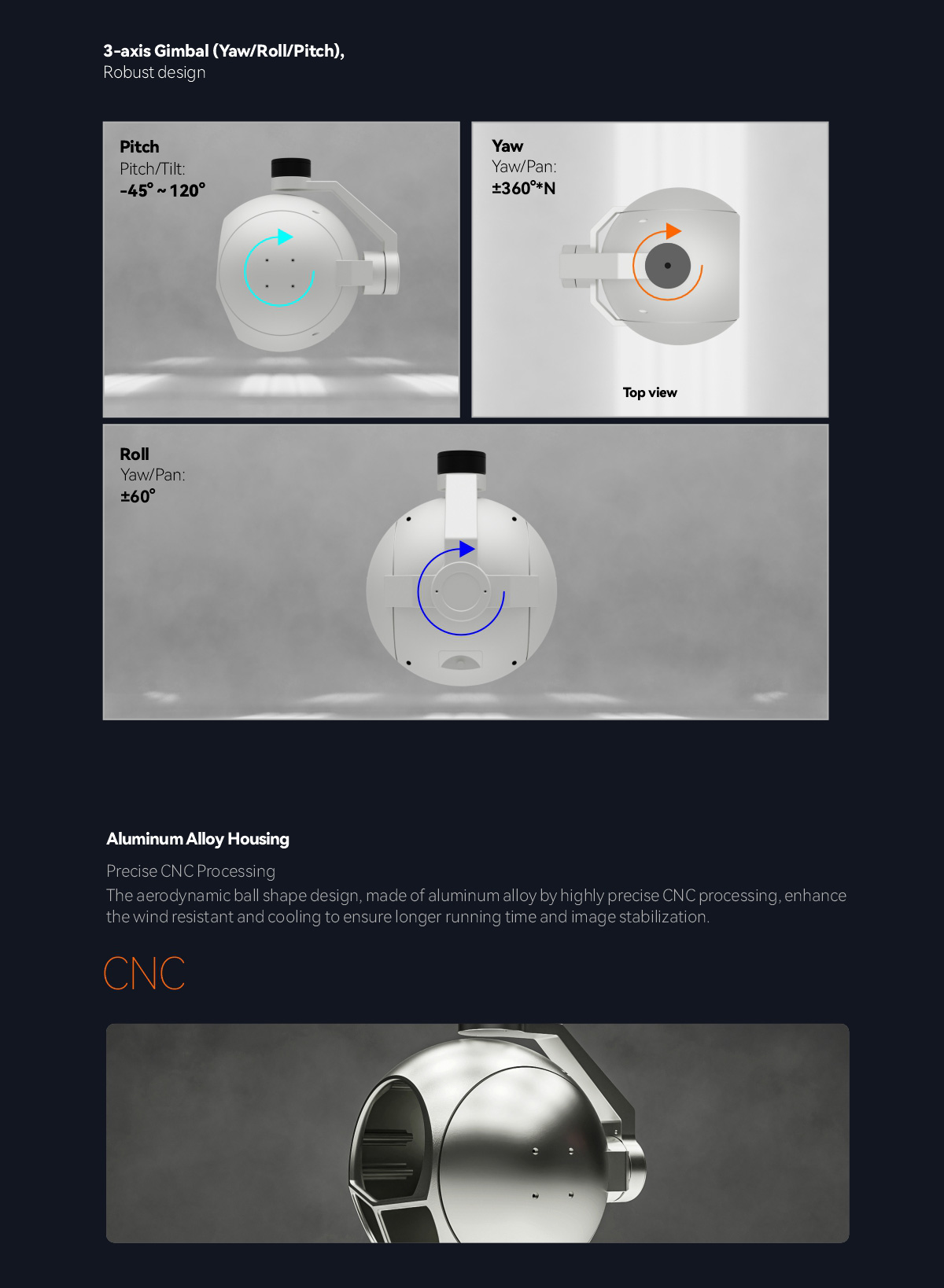 | Mechanical Range | Pitch/Tilt:-55°~105°, Roll: ±60°, Yaw/Pan: ±360°*N |