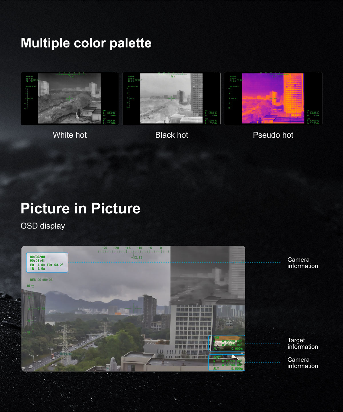 | OSD | Display the gimbal’s yaw and pitch angle, magnification, card recording duration, aircraft GPS and altitude, date and time |